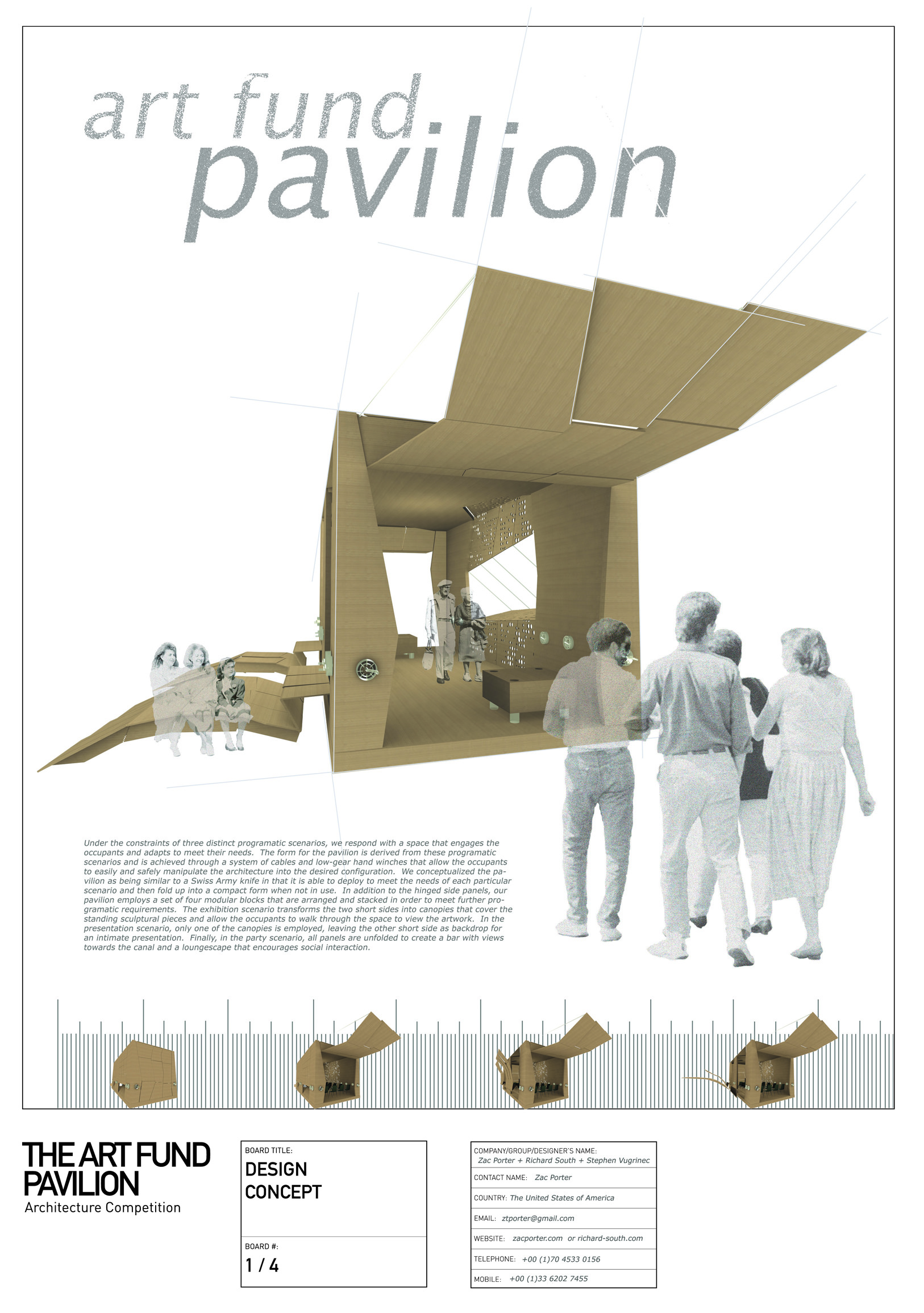Under the constraints of three distinct programatic scenarios, we respond with a space that engages the occupants and adapts to meet their needs. The form for the pavilion is derived from these programatic scenarios and is achieved through a system of cables and low-gear hand winches that allow the occupants to easily and safely manipulate the architecture into the desired configuration. We conceptualized the pavilion as being similar to a Swiss Army Knife in that it is able to deploy to meet the needs of each particular scenario and then fold up into a compact form when not in use. In addition to the hinged side panels, our pavilion employs a set of four modular blocks that are arranged and stacked in order to meet further programatic requirements. The exhibition scenario transforms the two short sides into canopies that cover the standing sculptural pieces and allow the occupants to walk through the space to view the artwork. In the presentation scenario, only one of the canopies is employed, leaving the other short side as backdrop for an intimate presentation. Finally, in the party scenario, all panels are unfolded to create a bar with views towards the canal and a loungescape that encourages social interaction.