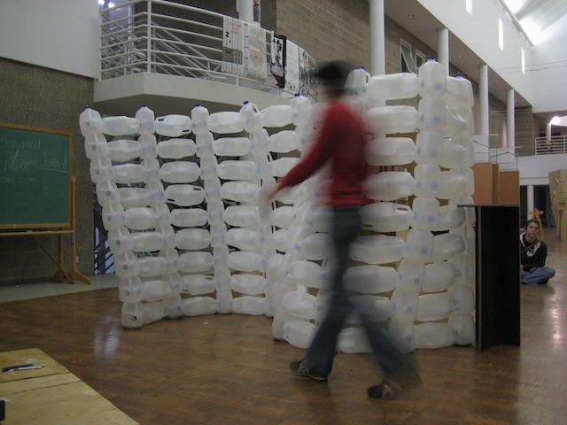 Inspired by the Blobwall Pavilion, and using everyday objects like one gallon milk jugs or water jugs, I have chosen to pursue the challenge of creating a wall system. It will be difficult to manipulate each plastic “brick” in the system precisely but it will be possible to create a wall system or system of enclosure. The goal will be to create a form that accurately demonstrates the texture and articulated surface of the containers.